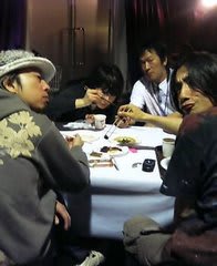 今日も、特別ゲストあり とてもuniqueでcuteな人でした 写真は、ライブ終了後のエンドリ一家、団らんの様子です 向こう左から:TAMAちゃん、竹野君 手前左から:ケンちゃん、SASUKE TAMAちゃん、美味しそう・・・ 投稿ナビゲーション E☆E 14日目 終了E☆E お台場公演 17日目 終了
