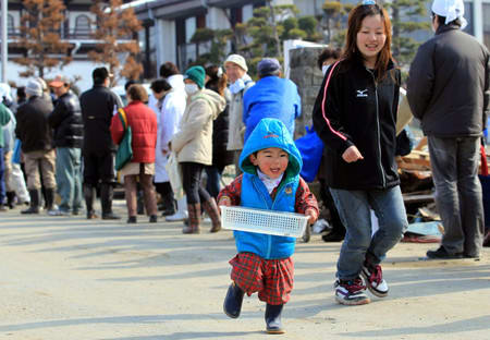小さな子が、カゴを持って、配給の列に並ぼうと走っています