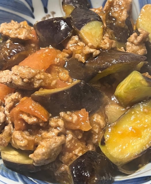 茄子(2本ぐらい)とトマト(大1)を加えて炒める
